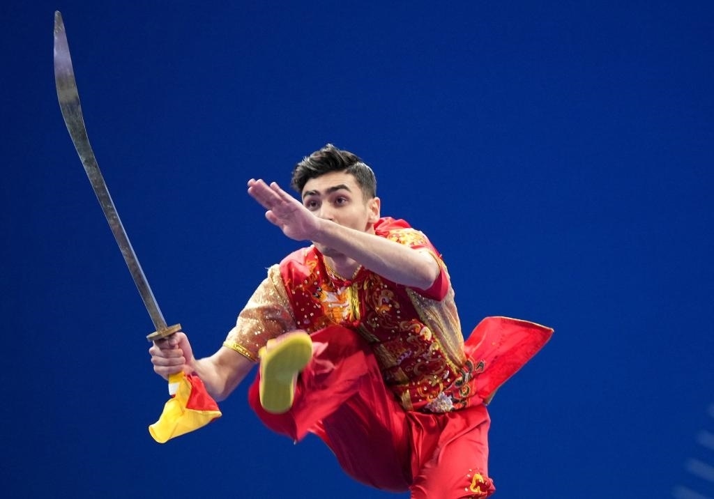 9月27日,伊朗選手侯賽因·蓋卜萊納邁·穆加達(dá)姆在刀術(shù)比賽中。當(dāng)日,杭州亞運(yùn)會(huì)武術(shù)男子刀術(shù)棍術(shù)全能決賽在杭州蕭山瓜瀝文化體育中心舉行。新華社記者 李一博 攝