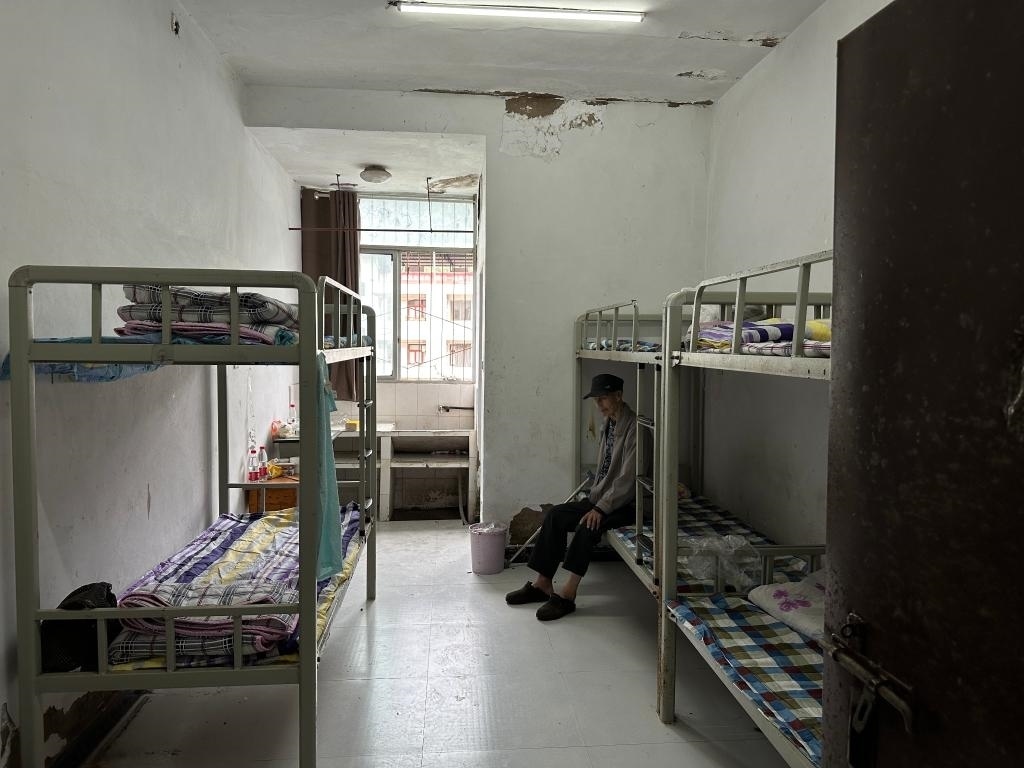 太白西村4組村民譚建和老爺爺行動不便,坐在鋪著干凈格子床單的宿舍床上望向窗外?!扒疤煜挛?,社區(qū)的車來接的我和老伴,安置點吃喝都好,宿舍住起來也挺舒服。兒子們擔心我,他們過不來,一天就打好幾通電話,我說都好著呢、好著呢?!弊T爺爺說。