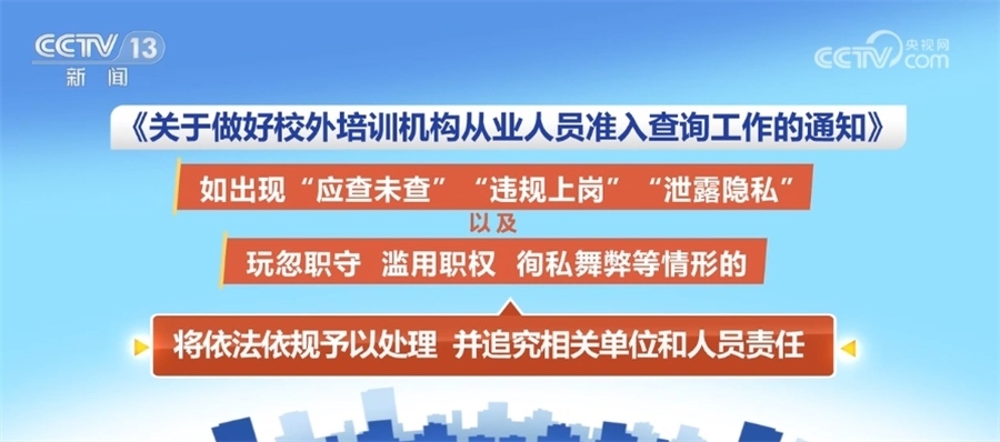 此外,《通知》強(qiáng)調(diào)嚴(yán)明查詢管理責(zé)任。各級(jí)教育部門(mén)和相關(guān)主管部門(mén)、校外培訓(xùn)機(jī)構(gòu)及其工作人員應(yīng)履行準(zhǔn)入查詢的法定職責(zé),如出現(xiàn)“應(yīng)查未查”“違規(guī)上崗”“泄露隱私”以及玩忽職守、濫用職權(quán)、徇私舞弊等情形的,將依法依規(guī)予以處理,并追究相關(guān)單位和人員責(zé)任。