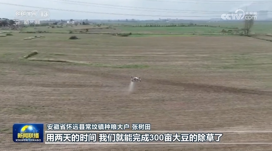 今年,皖北大豆主產區(qū)持續(xù)推進單產提升行動。在安徽懷遠縣種糧大戶張樹田的300畝大豆田里,無人機、植保機正在除草。由于夏播時全部采用大豆根瘤菌拌種,豆苗出得更齊、更壯。