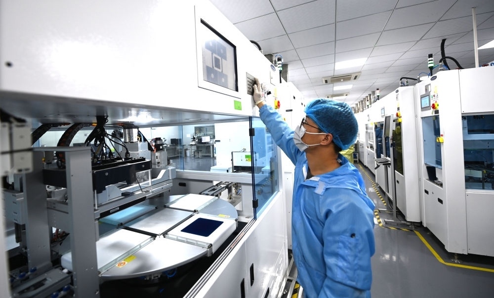 在杭州市富陽(yáng)區(qū)春江街道富春灣新城的杭州正銀電子材料有限公司的研發(fā)實(shí)驗(yàn)室內(nèi),自動(dòng)化設(shè)備在進(jìn)行光伏板的絲網(wǎng)印刷(3月22日攝)。新華社記者 徐昱 攝