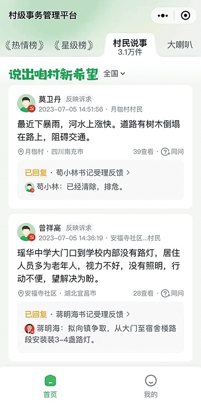 “老百姓把遇到的問題發(fā)布,我們看到后及時回復(fù)、解決,大大提高了工作效率?!笔孳娬f,他已經(jīng)養(yǎng)成習(xí)慣,每天都會看看村民在小程序說了啥事。