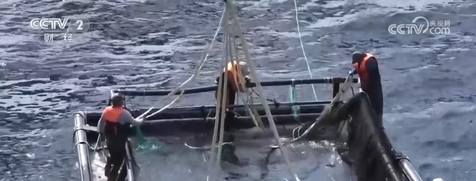 在煙臺長島南隍城海域,隨著經(jīng)海系列深水網(wǎng)箱里魚類的成熟,一場在大海上的收獲正在進(jìn)行。起降機(jī)將一個(gè)個(gè)裝滿魚兒的巨大網(wǎng)兜轉(zhuǎn)移到運(yùn)輸船上,2.5萬尾近4萬斤的成品黑鲪魚,將從這里銷往全國各地。