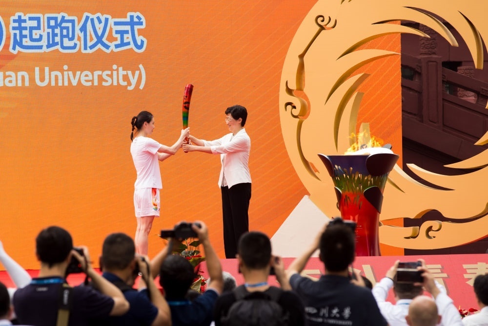 7月2日,第一棒火炬手吳敏霞(左)接過點(diǎn)燃的火炬。當(dāng)日,成都第31屆世界大學(xué)生夏季運(yùn)動會火炬?zhèn)鬟f成都站起跑儀式在四川大學(xué)校園內(nèi)舉行。新華社發(fā)(曹鵬攝)
