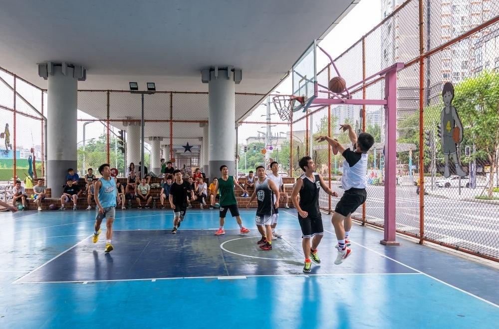 2022年6月12日,年輕人在成都市府青路立交下的運(yùn)動空間打籃球。新華社發(fā)(杜寧攝)