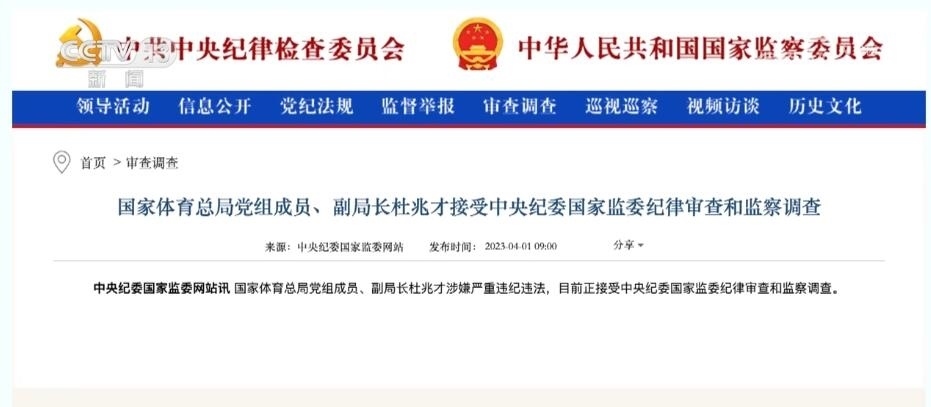 總臺(tái)央視記者 宋琎:今年3月27日,二十屆中央首輪巡視對(duì)象名單公布。“對(duì)國(guó)家體育總局黨組開(kāi)展機(jī)動(dòng)巡視”這一消息迅速成為社會(huì)熱點(diǎn)。之后不到一周,中央紀(jì)委國(guó)家監(jiān)委通報(bào),時(shí)任國(guó)家體育總局黨組成員、副局長(zhǎng)杜兆才接受審查調(diào)查。體育領(lǐng)域反腐成為今年反腐敗工作的一大重點(diǎn)。
