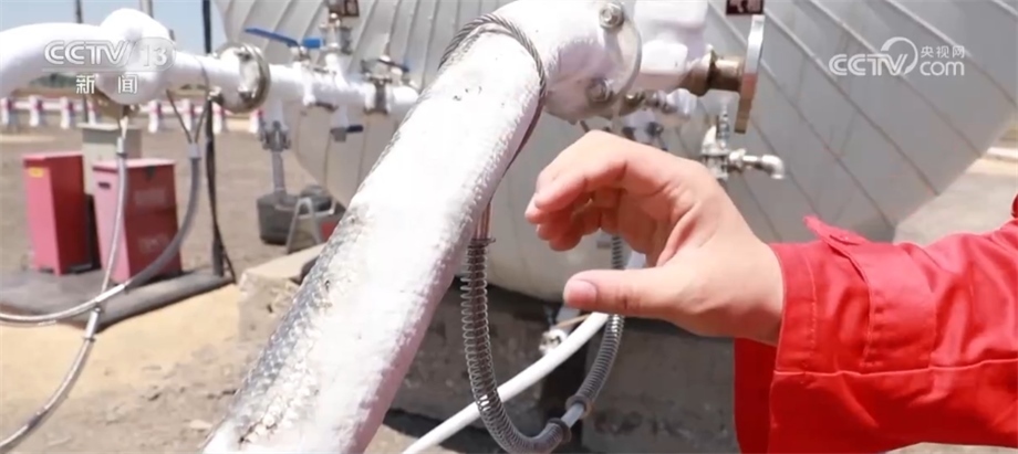 總臺記者 閆崎峰:可以看到我旁邊的這些管線上凝結(jié)了厚厚的白霜,管子里運(yùn)輸?shù)木褪堑蜏匾簯B(tài)下的二氧化碳。這些二氧化碳被這些高壓泵送入距離我腳下4000多米的原油層中。加入了二氧化碳的原油會變得蓬松、流動性好,便于采集,這種方式可以提高至少18%的采收率。