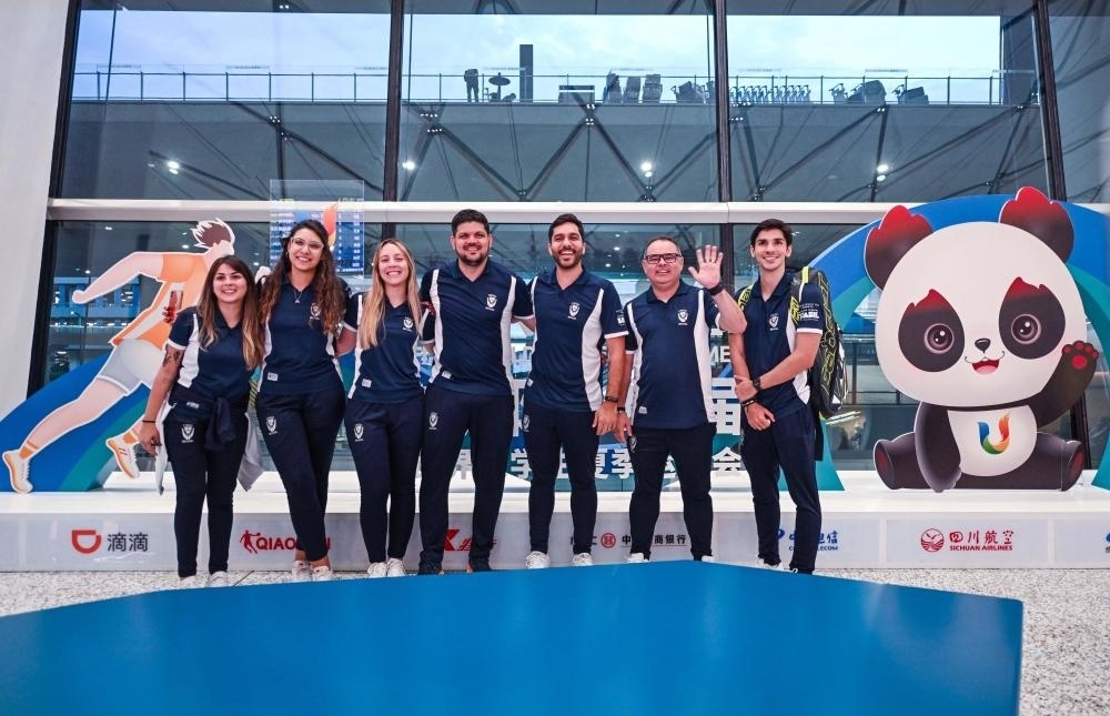 7月17日,首批抵蓉的巴西代表團(tuán)成員在成都天府國(guó)際機(jī)場(chǎng)合影留念。新華社記者 胥冰潔 攝