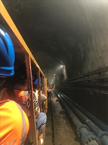 圖為采風(fēng)團(tuán)乘坐纜車前往江門中微子地下實(shí)驗(yàn)室。(新華網(wǎng) 王慰攝)