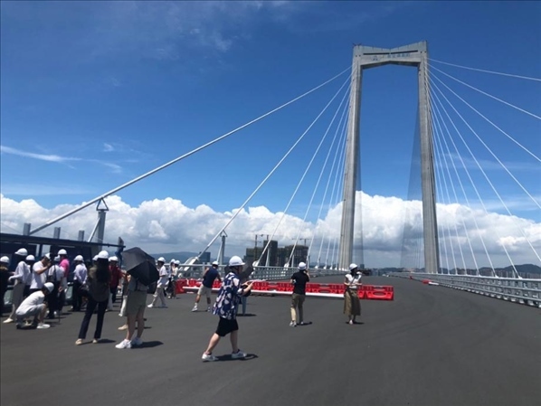 圖為采風(fēng)團(tuán)在深中通道中山大橋采風(fēng)點(diǎn)。(新華網(wǎng) 王慰攝)