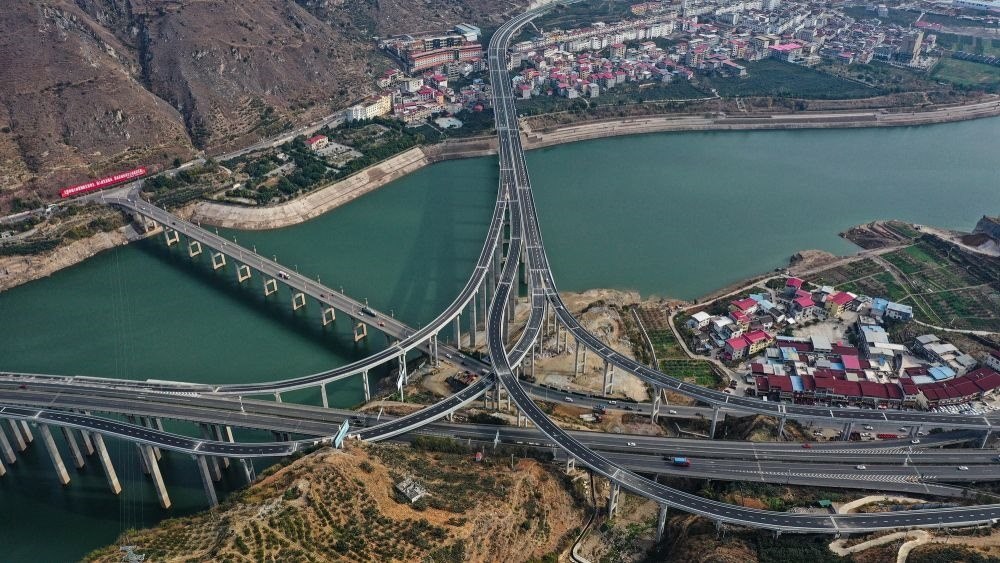 2022年12月30日,俯瞰峨眉至漢源高速公路流沙河樞紐互通(無(wú)人機(jī)照片)。新華社發(fā)(冉闖 攝)