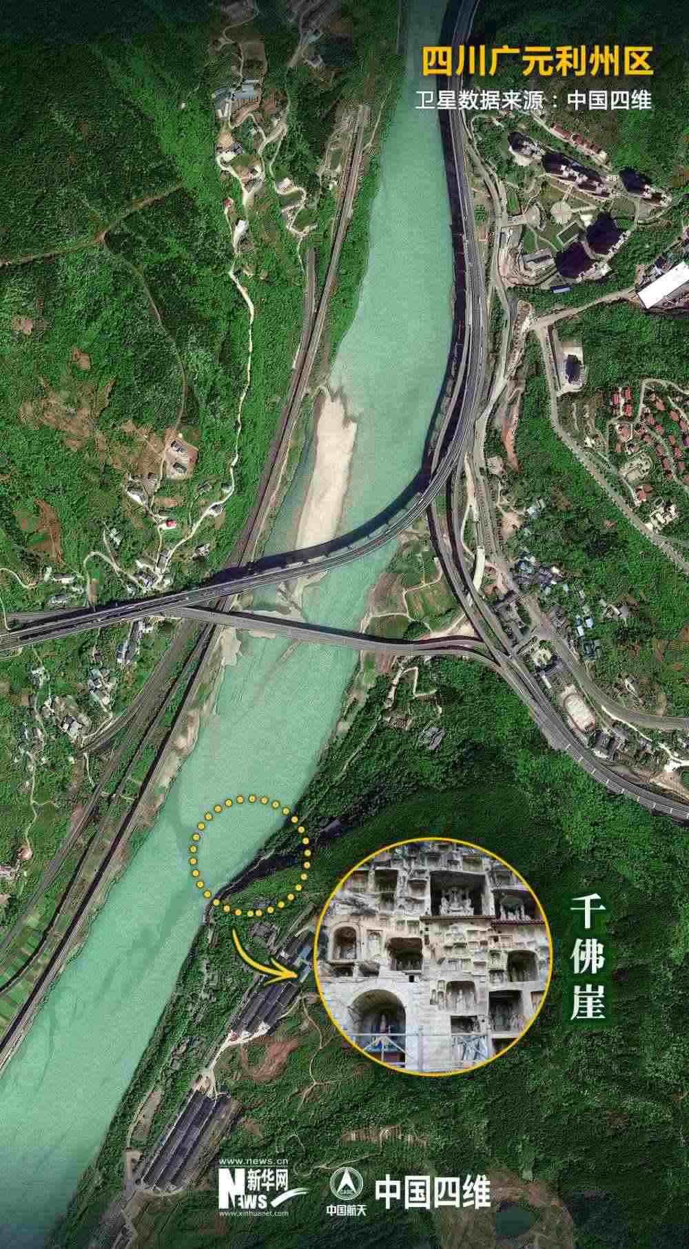 值得關(guān)注的是,就在千佛崖的河對(duì)岸,幾條現(xiàn)代化交通網(wǎng)錯(cuò)落有致地交織在一起。今日的廣元是名副其實(shí)的“交通博物館”。老川陜路、京昆高速、寶成鐵路、西成高鐵、嘉陵江航道在這里交織“奔騰”。橫渡嘉陵江,仿佛穿越古今。