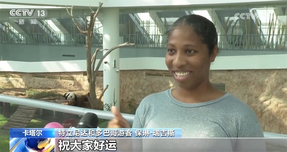 在卡塔爾的大熊貓館,很多前來參觀的游客得知大運會吉祥物“蓉寶”的原型也是一只熊貓,他們紛紛預祝大運會圓滿成功,祝福運動員們享受比賽,取得好成績。