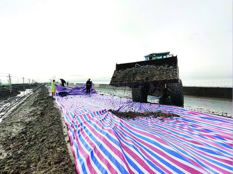 工作人員對海塘堤壩進行加固。(受訪者供圖)