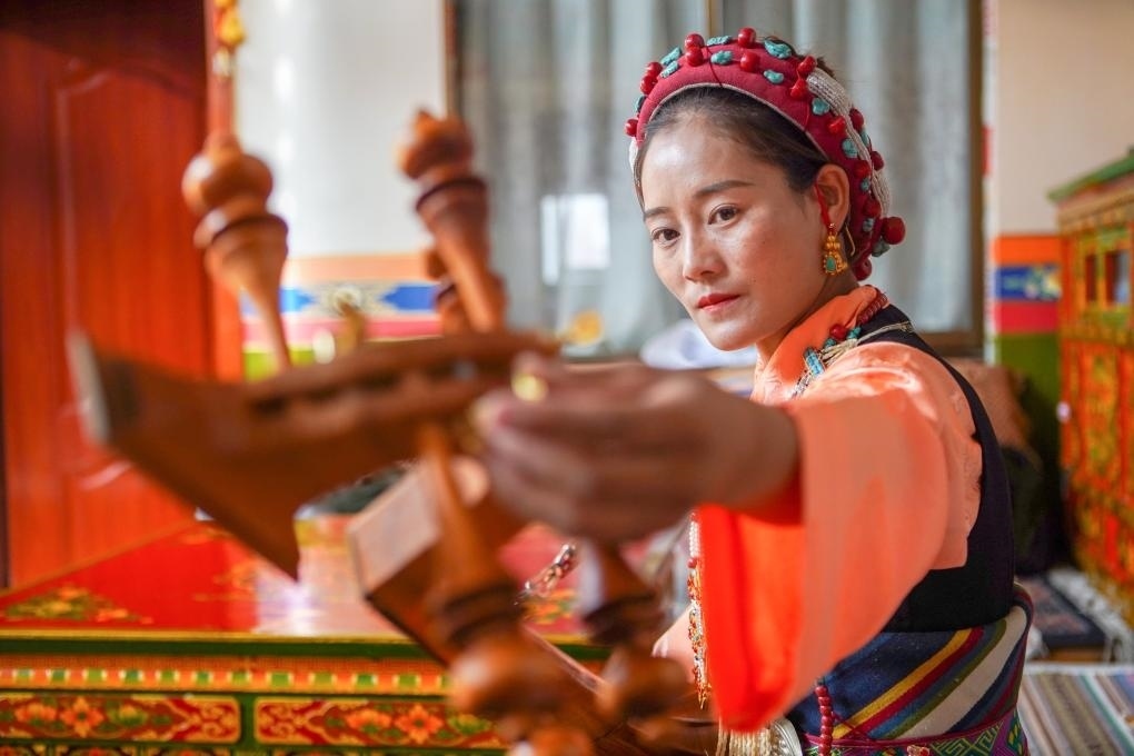 堆諧排練前,格桑卓瑪在家中為扎木念調(diào)音(8月4日攝)。新華社記者 邵澤東 攝