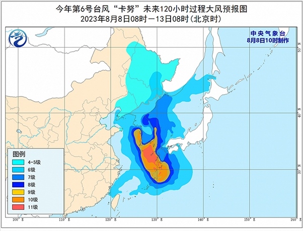 大風(fēng)預(yù)報(bào):預(yù)計(jì)8-11日,受“卡努”影響,渤海東部、渤海海峽、黃海、東海、臺(tái)灣海峽、浙江南部沿海、福建北部沿海、臺(tái)灣島北部沿海將有6~8級(jí)、陣風(fēng)9~10級(jí)的大風(fēng),其中黃海中部和南部偏東海域、東海東部部分海域風(fēng)力可達(dá)9~10級(jí)、陣風(fēng)11~12級(jí),“卡努”中心經(jīng)過(guò)的附近海面風(fēng)力有11~12級(jí)、陣風(fēng)13~14級(jí);10-13日,東北地區(qū)及山東半島沿岸海域有4~5級(jí)風(fēng)、陣風(fēng)6~7級(jí),黑龍江和吉林的部分地區(qū)有6~7級(jí)風(fēng)、陣風(fēng)8~9級(jí),局地風(fēng)力可達(dá)8~9級(jí)、陣風(fēng)10~11級(jí)。