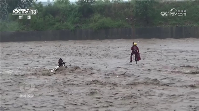 趙亞朋:“大吊車把我吊起來以后,我向下看距離地面有將近50米的高度,看著地面和洪水翻滾的樣子,心里當(dāng)時挺害怕的。因為整個身體在一根繩子上,身體沒有重心,身體不受控制,沒有發(fā)力點?!?/p>