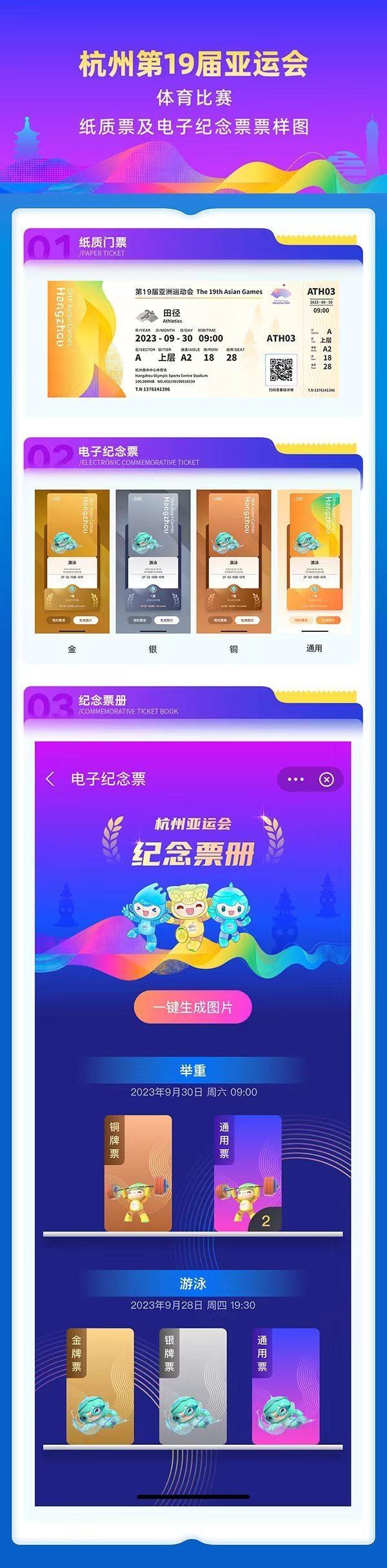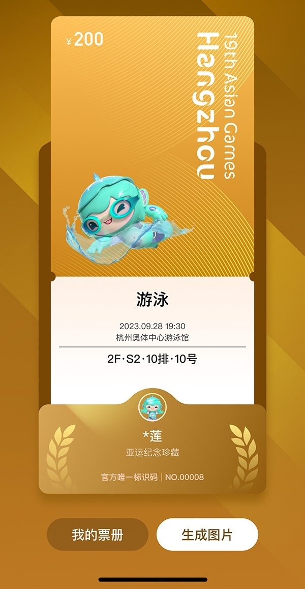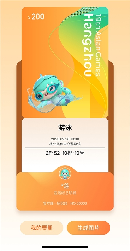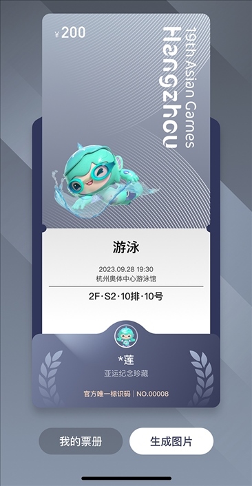 為呼吁全民助力綠色亞運(yùn),杭州亞運(yùn)會(huì)推薦使用電子票。凡購(gòu)買電子票的用戶均可在公眾售票官網(wǎng)H5頁(yè)面、智能亞運(yùn)一站通?票務(wù)通票夾中抽取對(duì)應(yīng)項(xiàng)目的電子紀(jì)念票,生成專屬票冊(cè),方便收藏、分享、傳播。電子紀(jì)念票分金、銀、銅、通用四種類型,抽中比例分別為5%、10%、15%、70%。電子紀(jì)念票和專屬電子票冊(cè)首次運(yùn)用于國(guó)內(nèi)舉辦的綜合性運(yùn)動(dòng)會(huì),是智能辦賽理念的生動(dòng)體現(xiàn)。