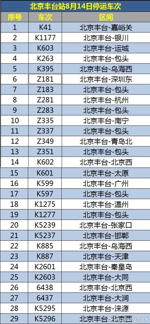 受水害影響,8月14日北京西站、北京豐臺站部分列車停運