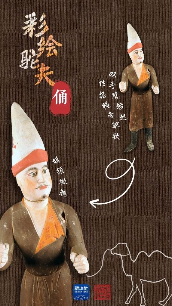 吐魯番阿斯塔那206號(hào)墓是唐代高昌左衛(wèi)大將軍張雄與妻子的合葬墓。墓中出土的木俑做工精湛,大多是由中原生產(chǎn),具有明顯的盛唐風(fēng)格,彩繪駝夫俑便出土于此。駝夫?yàn)楹四凶有蜗?,深目高鼻,胡須微翹,頭戴高聳折沿白氈尖帽,身著褐色掩襟長(zhǎng)袍,足穿高棱黑靴。此俑為分段雕刻膠合而成,再施以彩繪,面部表情富有神韻,惟妙惟肖。通過駝夫生動(dòng)的神情仿佛看到他牽著駱駝,帶著各色商品,沿著絲綢之路慢慢走來。