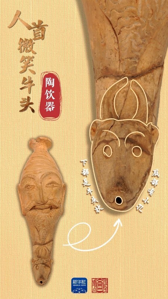 當(dāng)中國絲綢的美譽(yù)經(jīng)由古絲綢之路在西亞、歐洲等地傳揚(yáng)時(shí),西方文明也穿過風(fēng)沙與長(zhǎng)歌,在中國留下了印記。人首微笑牛頭陶飲器出土于和田地區(qū)約特干遺址,為唐代時(shí)期文物。飲器上部為人首形,下部是牛頭狀,底部帶小圓孔,上下兩部分內(nèi)腔相通。人首上唇胡須外展卷翹,面帶微笑。牛頭微微上翹,牛角豎立攏圓。這種飲器造型源自“來通”,即末端為動(dòng)物形或人首形的角杯,是小亞細(xì)亞和地中海地區(qū)常見的飲酒器具,絲綢之路沿線國家都有類似文物出土。
