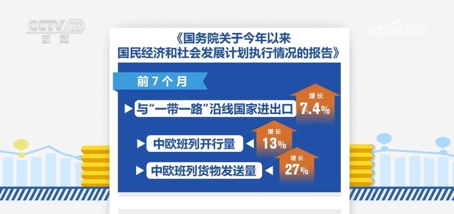 報告顯示,共建“一帶一路”持續(xù)推進。鞏固拓展與重點共建國家和國際組織的務(wù)實合作,進一步強化風(fēng)險防控,前7個月與“一帶一路”沿線國家進出口增長7.4%,中歐班列開行量、貨物發(fā)送量分別增長13%、27%。