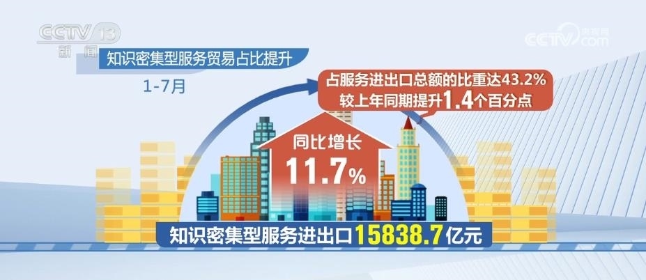 知識密集型服務(wù)貿(mào)易占比提升。1月—7月,知識密集型服務(wù)進(jìn)出口15838.7億元,同比增長11.7%,占服務(wù)進(jìn)出口總額的比重達(dá)43.2%,較上年同期提升1.4個百分點。