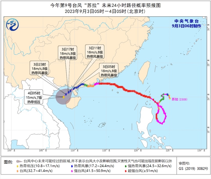 降水預(yù)報(bào):9月3日08時(shí)至4日08時(shí),受“蘇拉”和“??庇绊?,廣西中南部、廣東西南部、臺(tái)灣島等地部分地區(qū)有大到暴雨,其中,廣西中南部、臺(tái)灣島中東部等地部分地區(qū)有大暴雨,臺(tái)灣島東部部分地區(qū)有特大暴雨(250-600毫米)。