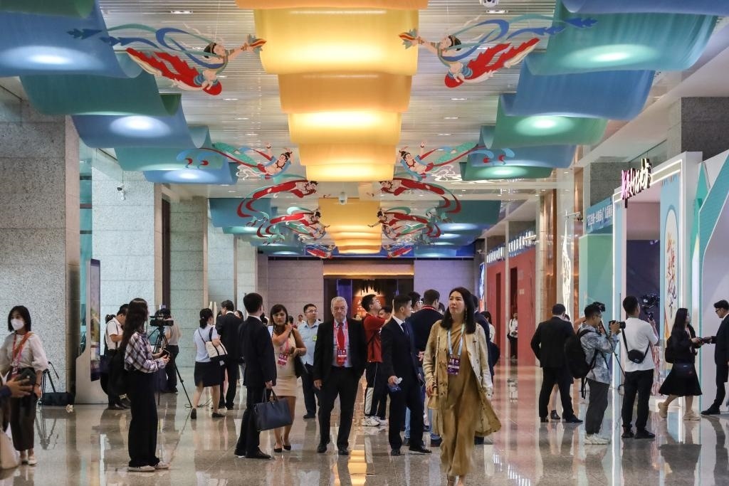 9月6日,與會(huì)嘉賓在第六屆絲綢之路(敦煌)國(guó)際文化博覽會(huì)上參觀文創(chuàng)產(chǎn)品和文旅裝備展銷(xiāo)活動(dòng)。新華社記者 馬希平 攝