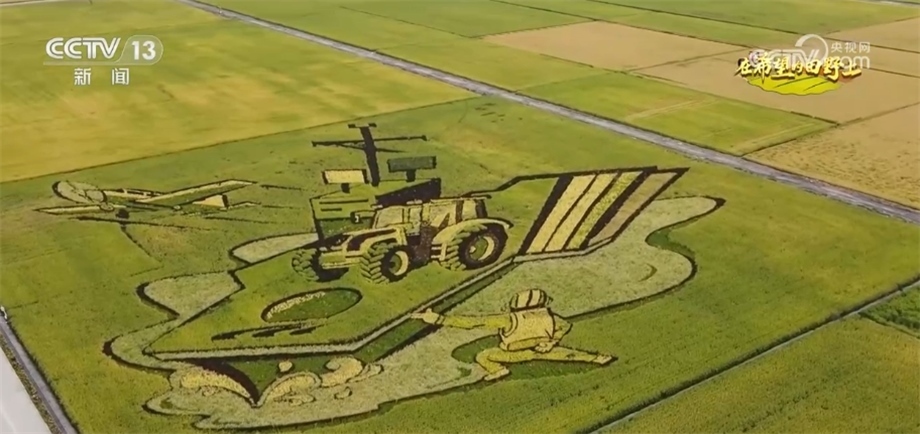 總臺央視記者 蔣樹林:金秋9月的稻田是什么顏色的?9月的稻香又是什么味道?來這里,有可能會(huì)找到您想要的答案。我現(xiàn)在是在黑龍江北大荒閆家崗農(nóng)場。大家來看,這個(gè)稻田觀景臺有十多米高,因此站在這里,秋日稻田大片的圖案映入眼簾,今年稻田畫以“鄉(xiāng)村振興”“數(shù)字農(nóng)業(yè)”為主題,生動(dòng)展現(xiàn)了“讓農(nóng)業(yè)更美好、讓農(nóng)民更幸?!钡拿篮迷妇?。稻田畫是農(nóng)民們勤勞與智慧的展現(xiàn),他們用稻田畫為家鄉(xiāng)水稻代言,而對于在黑土地打拼的北大荒人而言,還有更重要的意義。