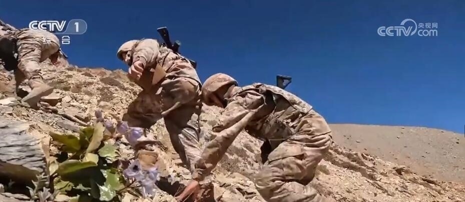 一路走走停停艱難前行。巡邏車行駛至距離點位6公里處停了下來,由于道路塌陷,官兵們只好下車改為徒步巡邏。行走在坡度近70度的陡峭山路上,路面全是碎石,加上海拔不斷攀升,這對巡邏官兵的體能是極大的挑戰(zhàn)。經過近4個小時的艱難攀爬,巡邏分隊終于到達了點位。