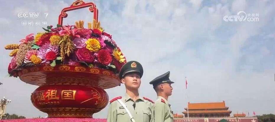 在北京,天安門廣場內祝福祖國的巨型花籃吸引著眾多游客前來觀賞拍攝。武警官兵在完成好巡邏執(zhí)勤任務的同時,協(xié)助工作人員進行游客疏導也成為一項重要的工作。