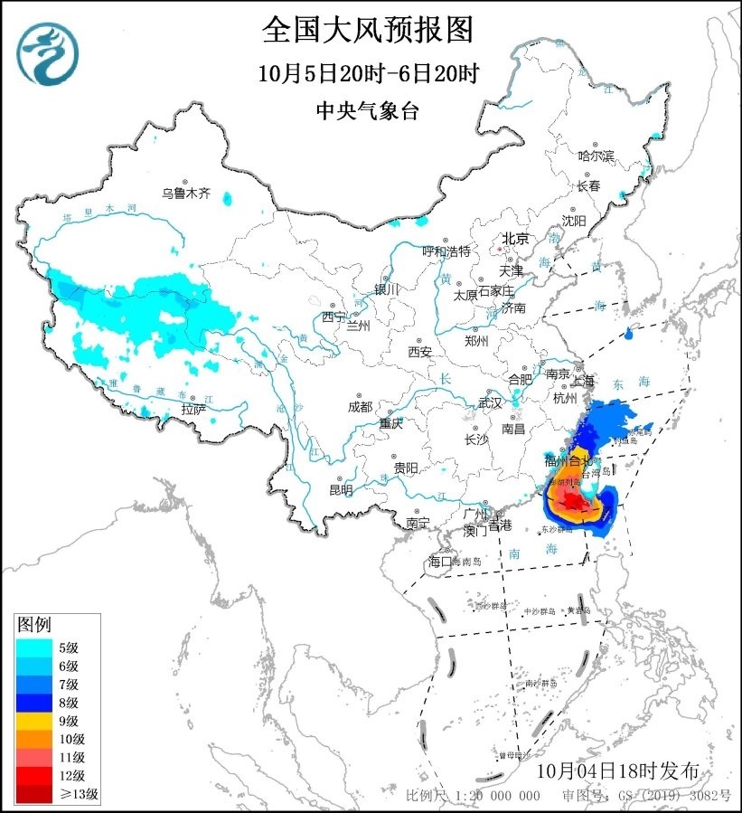 10月5日20時至6日20時,東海西南部海域、臺灣海峽、臺灣以東洋面偏南海域、巴士海峽偏北海域、南海東北部偏北海域?qū)⒂?~8級、陣風(fēng)9~10級的大風(fēng),其中臺灣海峽、南海東北部的部分海域風(fēng)力可達(dá)9~10級、陣風(fēng)11~12級,臺風(fēng)“小犬”中心經(jīng)過的附近海域風(fēng)力可達(dá)11~12級、陣風(fēng)13級;西藏西部、浙江沿海、福建沿海、臺灣島將有5~6級、陣風(fēng)7級的大風(fēng)。