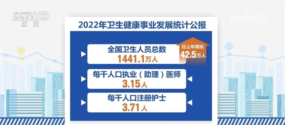 《公報(bào)》顯示,我國醫(yī)療衛(wèi)生資源總量繼續(xù)增加。到2022年末,全國醫(yī)療衛(wèi)生機(jī)構(gòu)達(dá)到1032918個(gè),比上年增加1983個(gè)。全國共設(shè)置13個(gè)類別的國家醫(yī)學(xué)中心和兒童類別的國家區(qū)域醫(yī)療中心。全國醫(yī)療衛(wèi)生機(jī)構(gòu)床位975.0萬張,每千人口醫(yī)療衛(wèi)生機(jī)構(gòu)床位數(shù)由2021年的6.70張?jiān)黾拥?022年的6.92張。全國衛(wèi)生人員總數(shù)1441.1萬人,比上年增加42.5萬人。每千人口執(zhí)業(yè)(助理)醫(yī)師3.15人,每千人口注冊護(hù)士3.71人。