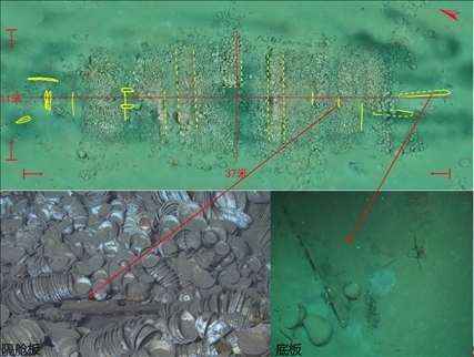 沉船遺址水深約30米,主體區(qū)域殘存有木質(zhì)船體和成摞擺放的船貨堆積,范圍約300平方米??脊虐l(fā)掘發(fā)現(xiàn),沉船船體殘長(zhǎng)約16.95米,最寬處保存約4.5米,殘存9道隔艙板和10個(gè)船艙,單層板結(jié)構(gòu),發(fā)現(xiàn)桅座、龍骨板、龍骨補(bǔ)強(qiáng)材以及舭龍骨等船體構(gòu)件。