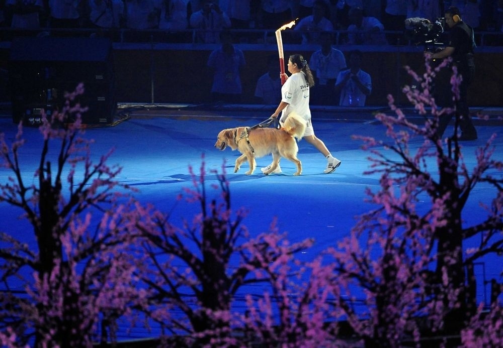 2008年9月6日,北京2008年殘奧會(huì)開幕式在國(guó)家體育場(chǎng)隆重舉行,火炬手平亞麗在進(jìn)行火炬?zhèn)鬟f。新華社記者王頌攝