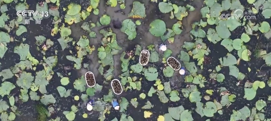 在安徽霍邱縣宋店鎮(zhèn)小路芡實種植家庭農(nóng)場,十幾名工人正在水中采摘芡實。
