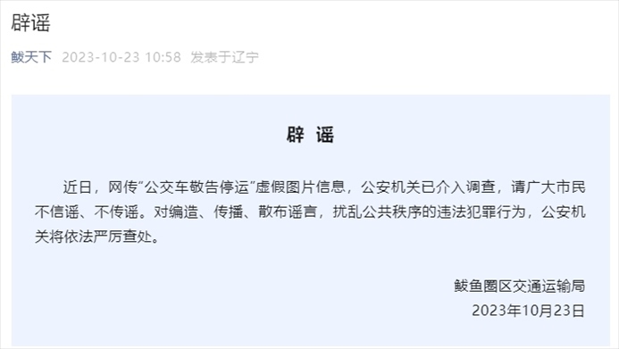 ·網(wǎng)傳“公交車敬告停運(yùn)”,遼寧營(yíng)口鲅魚圈區(qū)交通運(yùn)輸局辟謠:系虛假圖片,公安已介入。