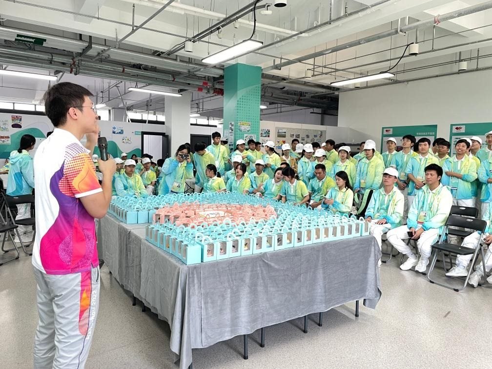 在富陽水上運動中心,和他一樣參加杭州亞運會和亞殘運會志愿服務(wù)工作的同學(xué)還有300多名。因與“親和”諧音而被稱作“小青荷”的志愿者們,身著白綠相間的統(tǒng)一服裝,在青山綠水間上演著“小荷才露尖尖角”。