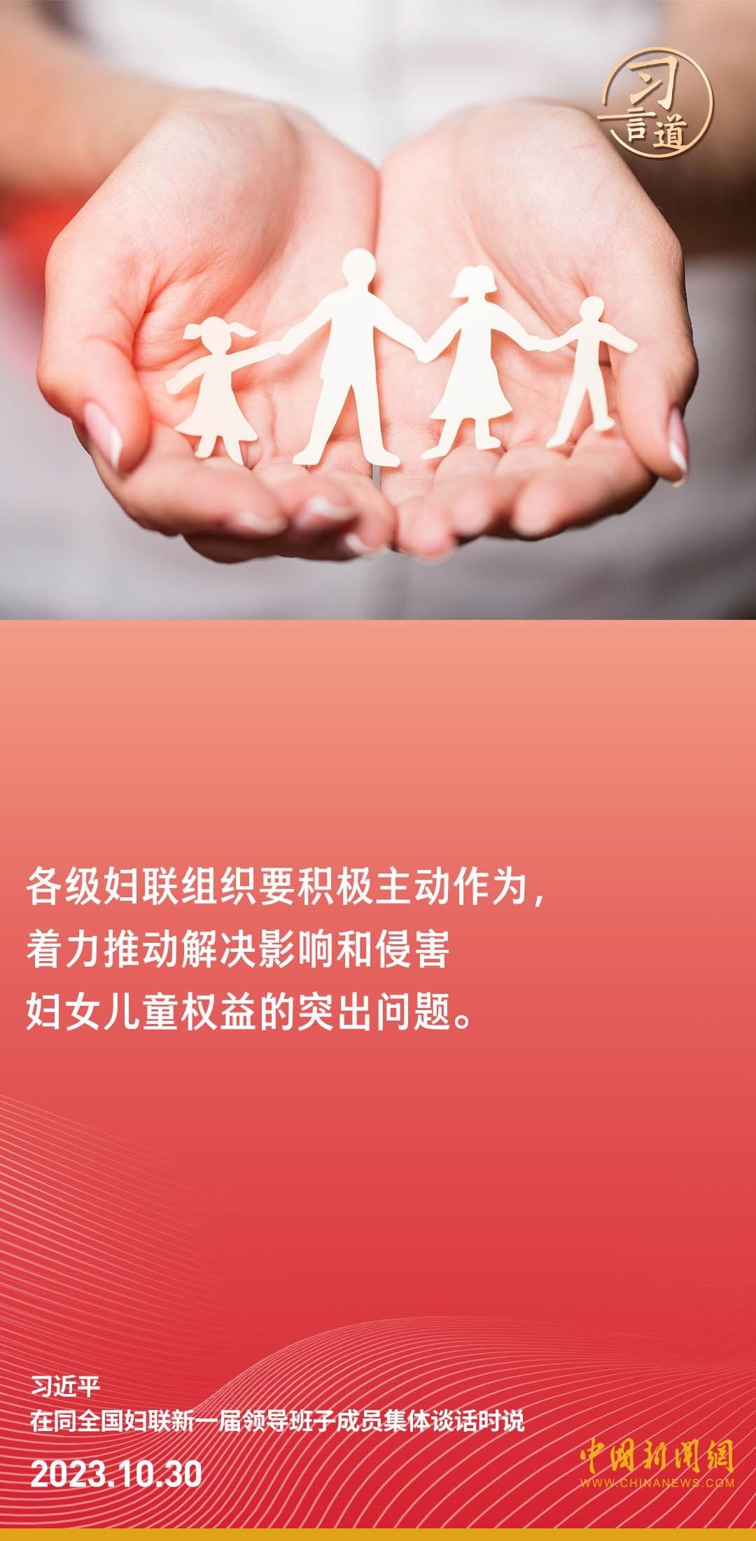 中共中央總書記、國(guó)家主席、中央軍委主席習(xí)近平30日下午在中南海同全國(guó)婦聯(lián)新一屆領(lǐng)導(dǎo)班子成員集體談話并發(fā)表重要講話。習(xí)近平強(qiáng)調(diào)——