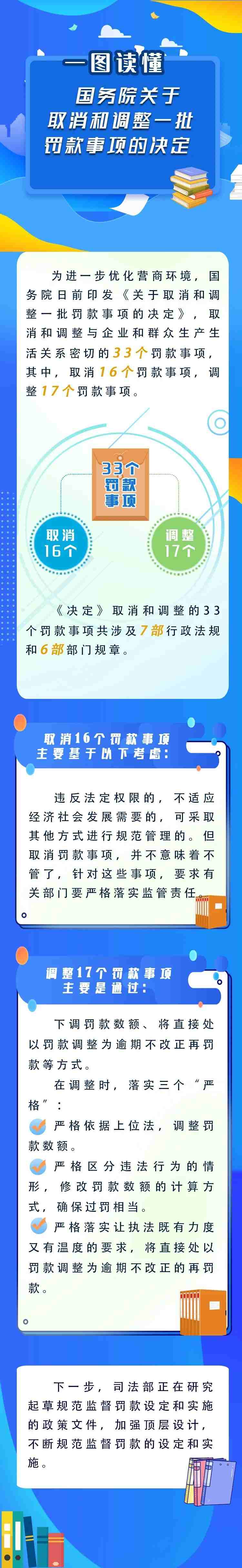 國務(wù)院日前印發(fā)《關(guān)于取消和調(diào)整一批罰款事項(xiàng)的決定》(以下簡稱《決定》),取消調(diào)整與企業(yè)和群眾生產(chǎn)生活關(guān)系密切的33個(gè)罰款事項(xiàng)。