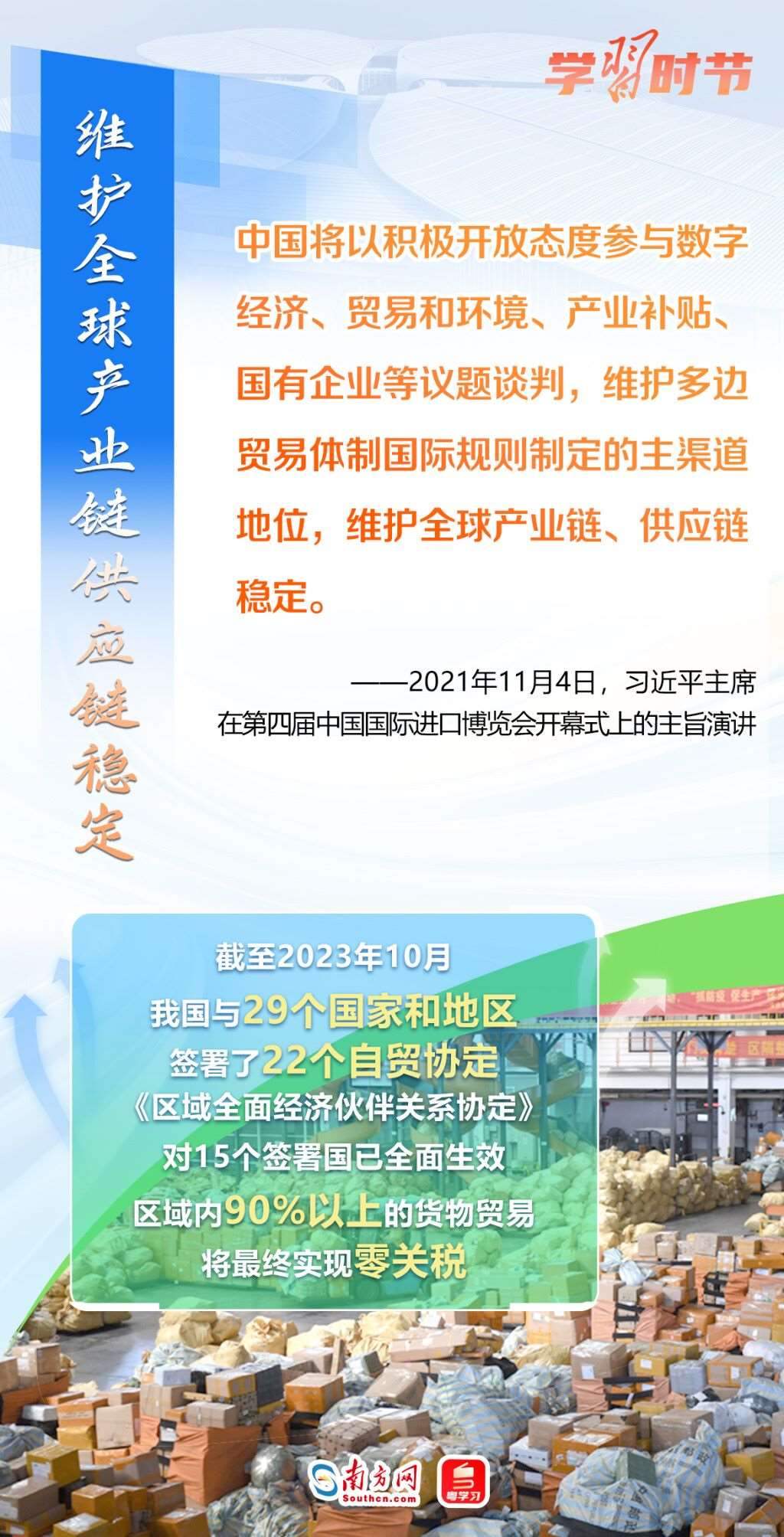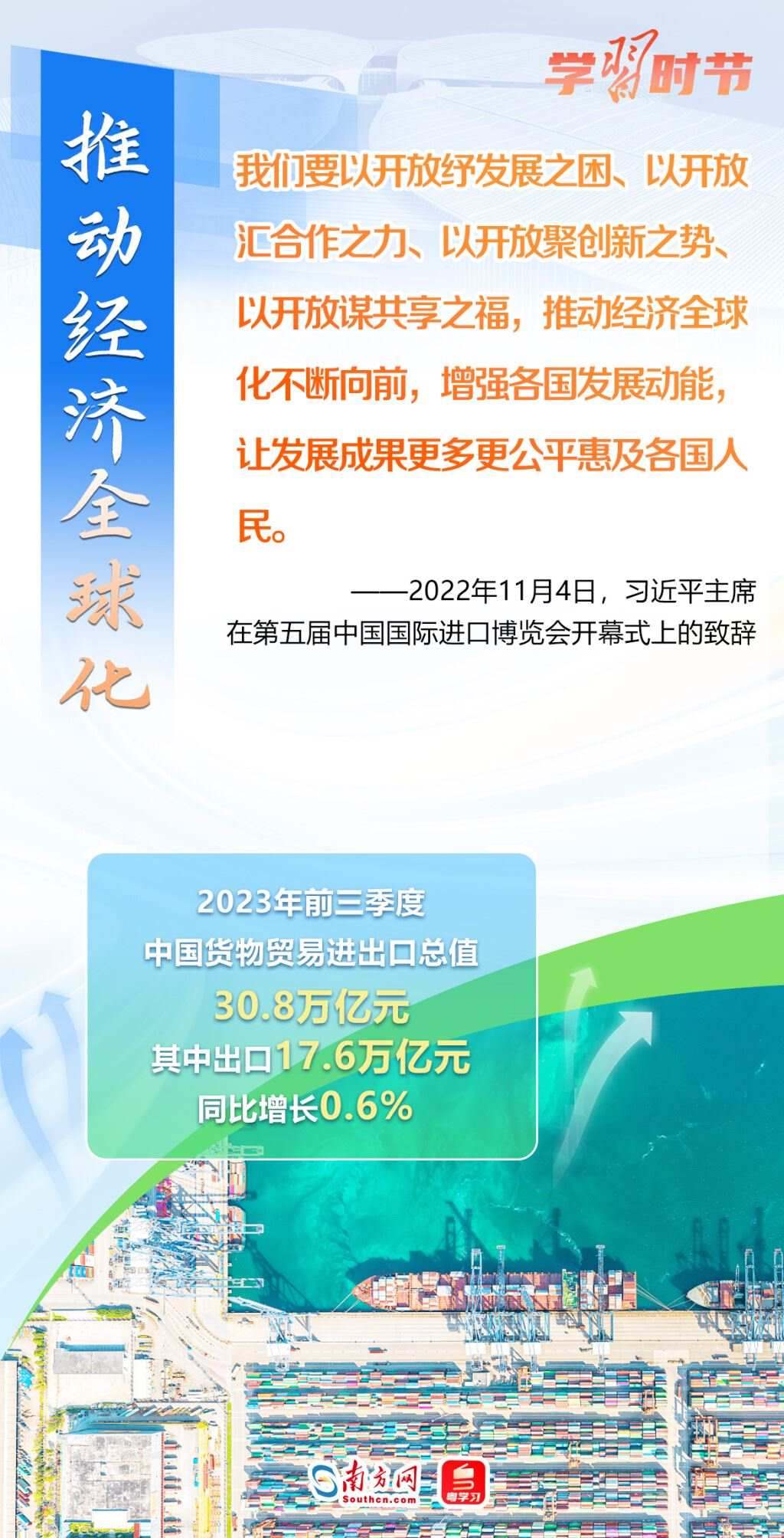 11月5日至10日,第六屆中國國際進(jìn)口博覽會將在上海舉行。這個由習(xí)近平主席親自謀劃、親自部署、親自推動的世界上首個以進(jìn)口為主題的國家級展會,目前已成為舉世矚目的貿(mào)易盛會、開放合作的重要平臺、全球共享的國際公共產(chǎn)品。第六屆進(jìn)博會舉行在即,讓我們通過一組海報,重溫習(xí)近平主席在過去五屆進(jìn)博會上的重要講話,深刻認(rèn)識高水平對外開放的時代意義與關(guān)鍵作用。
