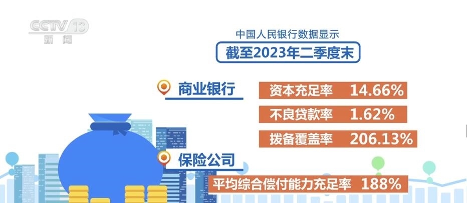 中國(guó)人民銀行數(shù)據(jù)顯示,截至2023年二季度末,商業(yè)銀行資本充足率、不良貸款率和撥備覆蓋率分別為14.66%、1.62%和206.13%,保險(xiǎn)公司平均綜合償付能力充足率188%,證券公司風(fēng)險(xiǎn)覆蓋率、平均資本杠桿率分別為255.38%、18.78%,信用風(fēng)險(xiǎn)處于可控水平,損失抵御能力總體較為充足。