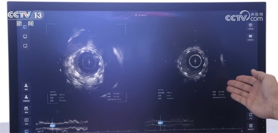 總臺央視記者 褚爾嘉:這里是一個傳統(tǒng)的血管的超聲圖像,我們可以看到血管的全貌。右邊這里是一個工作頻率高達(dá)100兆赫茲的超高頻的血管內(nèi)超聲圖像,通過技術(shù)升級,現(xiàn)在我們可以更加清晰地看到冠狀動脈的精細(xì)結(jié)構(gòu),這也是目前世界上清晰度最高的一個血管內(nèi)的超聲圖像。