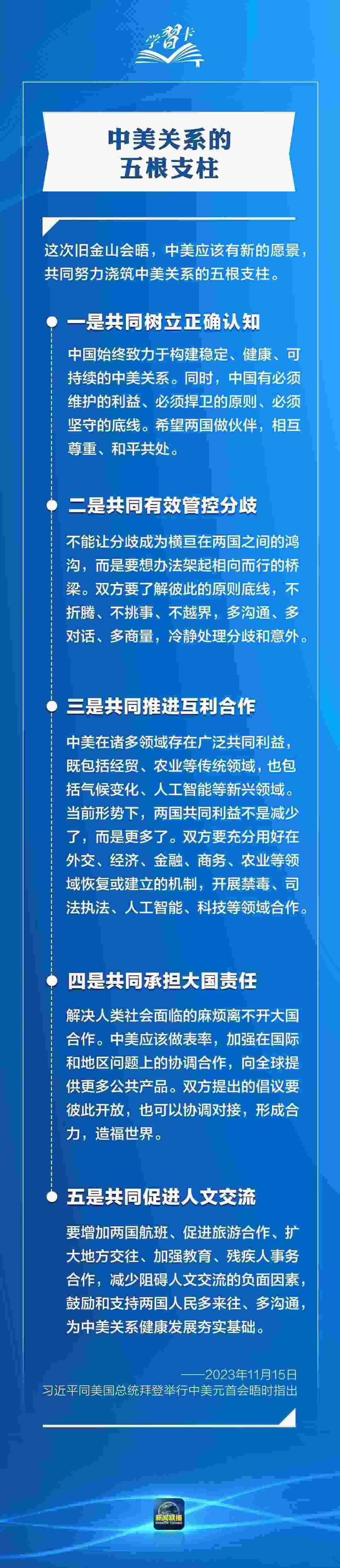 習(xí)近平多次指出,作為兩個世界大國,中美能否確立正確相處之道,攸關(guān)世界和平發(fā)展和人類前途命運。發(fā)展中美關(guān)系,習(xí)主席強(qiáng)調(diào)三點原則、四個方面、五根支柱,一起學(xué)習(xí)→