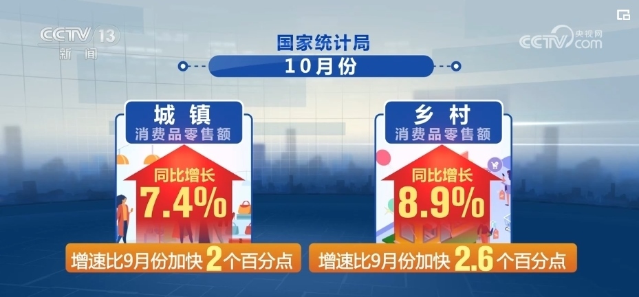 國(guó)家統(tǒng)計(jì)局最新數(shù)據(jù)顯示,在縣鄉(xiāng)消費(fèi)市場(chǎng)基礎(chǔ)設(shè)施不斷完善、有效供給持續(xù)擴(kuò)大等有利條件帶動(dòng)下,鄉(xiāng)村市場(chǎng)銷售增速快于城鎮(zhèn)。10月份,城鎮(zhèn)、鄉(xiāng)村消費(fèi)品零售額同比分別增長(zhǎng)7.4%和8.9%,增速比9月份分別加快2和2.6個(gè)百分點(diǎn)。