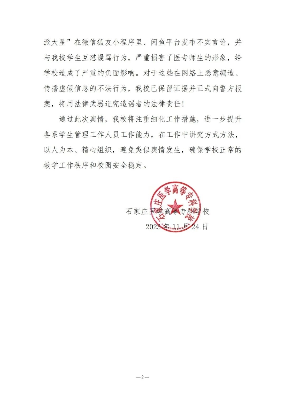 央視網(wǎng)消息:近日,網(wǎng)傳石家莊醫(yī)學(xué)高等??茖W(xué)校檢查學(xué)生宿舍,并將沒收來的物品掛在二手平臺咸魚上出售,事件引發(fā)關(guān)注。11月24日,石家莊醫(yī)學(xué)高等專科學(xué)校發(fā)布聲明稱,22日學(xué)校利用學(xué)生在宿舍時間,排查大功率違規(guī)電器。查獲違規(guī)電器分別由各系登記造表、統(tǒng)一保管,定于放寒假時返還學(xué)生帶回家。經(jīng)核實,網(wǎng)傳短視頻實為學(xué)生準(zhǔn)備去實習(xí)一起收拾房間物品時的視頻,被別有用心人員移花接木、惡意引用。此外,網(wǎng)名為“林北我叫派大星”在微信狐友小程序里、閑魚平臺發(fā)布不實言論,并與學(xué)校學(xué)生互懟謾罵行為,嚴(yán)重?fù)p害了醫(yī)專師生的形象,給學(xué)校造成了嚴(yán)重的負(fù)面影響。學(xué)校已保留證據(jù)并正式向警方報案。