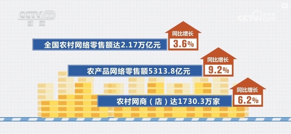 全國(guó)農(nóng)村網(wǎng)絡(luò)零售額達(dá)2.17萬億元,同比增長(zhǎng)3.6%;農(nóng)產(chǎn)品網(wǎng)絡(luò)零售額5313.8億元,同比增長(zhǎng)9.2%;農(nóng)村網(wǎng)商(店)達(dá)1730.3萬家,同比增長(zhǎng)6.2%。