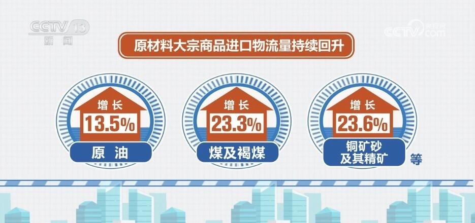 從貨類看,10月份,在消費帶動下,糧食、大豆、食用油等進口量增速超過20%。原油、煤及褐煤、銅礦砂及其精礦等原材料大宗商品進口物流量持續(xù)回升,分別增長13.5%、23.3%和23.6%。