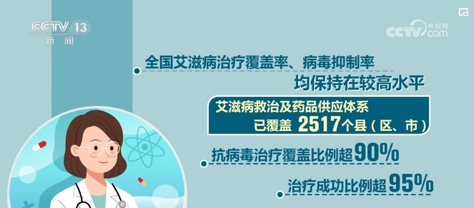 全國艾滋病治療覆蓋率、病毒抑制率均保持在較高水平。艾滋病救治及藥品供應(yīng)體系已覆蓋2517個(gè)縣(區(qū)、市),抗病毒治療覆蓋比例超90%,治療成功比例超95%。